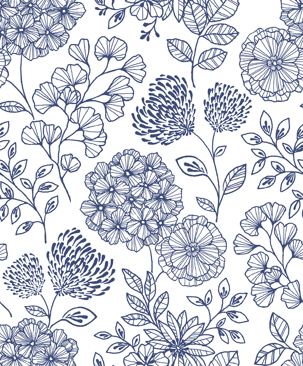 2975-26205 - Ada Blue Floral Wallpaper. Add architectural depth to your walls with this bold geometric design. It features clean lines and a sophisticated navy hue. The raised ink finish provides a subtle tactile texture that catches the light. This wallpaper creates a stunning focal point for offices or modern entryways. It is unpasted and designed for a seamless, professional look.. The width in (in) 20.5 X 33 product length in (ft) covering About 56.4 square feet. Product Match is Straight. Product Repeat is 25.2. Material is Non Woven. Adhesion Type is Unpasted - Washable - Strippable. The Color is Blues