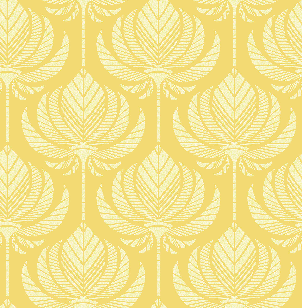 4014-26427 - Palmier Yellow Lotus Fan Wallpaper. Add architectural depth to your walls with this bold geometric design. It features clean lines and a sophisticated navy hue. The raised ink finish provides a subtle tactile texture that catches the light. This wallpaper creates a stunning focal point for offices or modern entryways. It is unpasted and designed for a seamless, professional look.. The width in (in) 20.5 X 33 product length in (ft) covering About 56.4 square feet. Product Match is Straight. Product Repeat is 10.4. Material is Non Woven. Adhesion Type is Unpasted - Washable - Strippable. The Color is Yellows