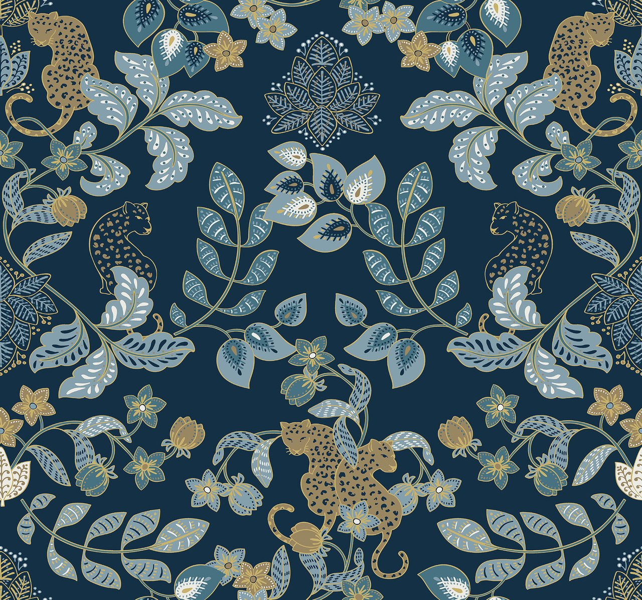 4034-72133 - Getty Navy Jungle Damask Wallpaper. Add architectural depth to your walls with this bold geometric design. It features clean lines and a sophisticated navy hue. The raised ink finish provides a subtle tactile texture that catches the light. This wallpaper creates a stunning focal point for offices or modern entryways. It is unpasted and designed for a seamless, professional look.. The width in (in) 27 X 27 product length in (ft) covering About 60.8 square feet. Product Match is Straight. Product Repeat is 25.25. Material is Non Woven. Adhesion Type is Unpasted - Washable - Strippable. The Color is Blues