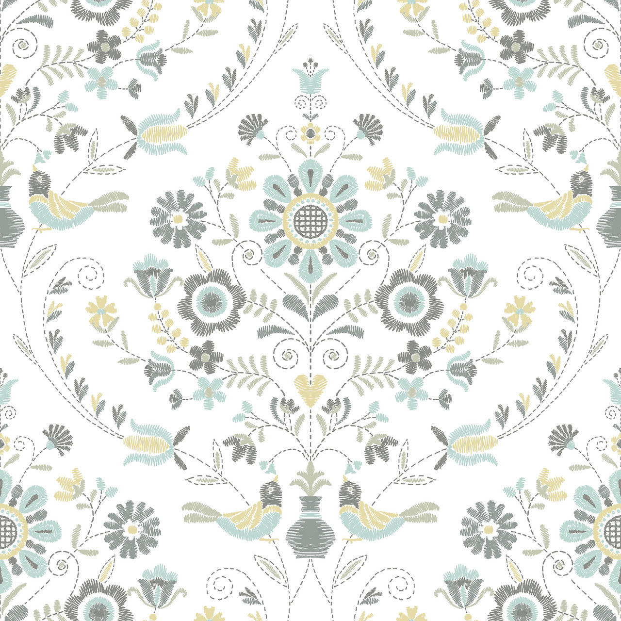 4066-26510 - Britt Sea Green Embroidered Damask Wallpaper. Bring the outdoors in with this elegant botanical print. It features delicate ferns in a soft sage green palette. The design adds a refreshing, organic feel to any room. Printed on high-quality non-woven paper, it is durable and easy to strip. Perfect for a calming bedroom or a farmhouse-style living area. . The width in (in) 20.5 X 33 product length in (ft) covering About 56.4 square feet. Product Match is Straight. Product Repeat is 20.9. Material is Non Woven. Adhesion Type is Unpasted - Washable - Strippable. The Color is Greens