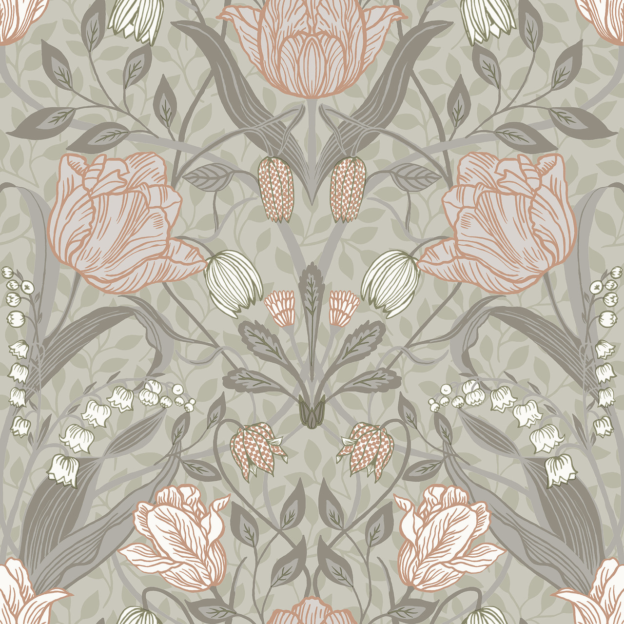 4080-44105 - Filippa Grey Tulip Wallpaper. Bring the outdoors in with this elegant botanical print. It features delicate ferns in a soft sage green palette. The design adds a refreshing, organic feel to any room. Printed on high-quality non-woven paper, it is durable and easy to strip. Perfect for a calming bedroom or a farmhouse-style living area. . The width in (in) 20.9 X 33 product length in (ft) covering About 57.5 square feet. Product Match is Straight. Product Repeat is 20.9. Material is Non Woven. Adhesion Type is Unpasted - Washable - Strippable. The Color is Greys