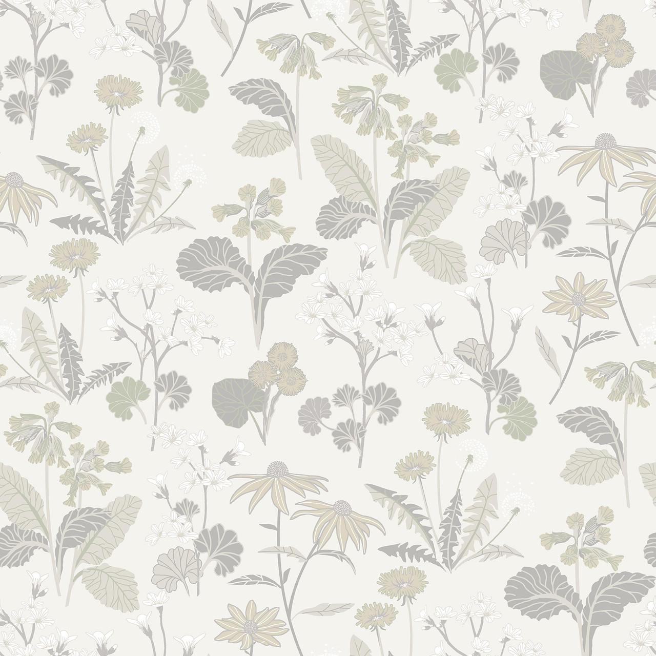 4080-92136 - Magdalena Light Grey Dandelion Wallpaper. Bring the outdoors in with this elegant botanical print. It features delicate ferns in a soft sage green palette. The design adds a refreshing, organic feel to any room. Printed on high-quality non-woven paper, it is durable and easy to strip. Perfect for a calming bedroom or a farmhouse-style living area. . The width in (in) 20.9 X 33 product length in (ft) covering About 57.5 square feet. Product Match is Straight. Product Repeat is 20.9. Material is Non Woven. Adhesion Type is Unpasted - Washable - Strippable. The Color is Greys