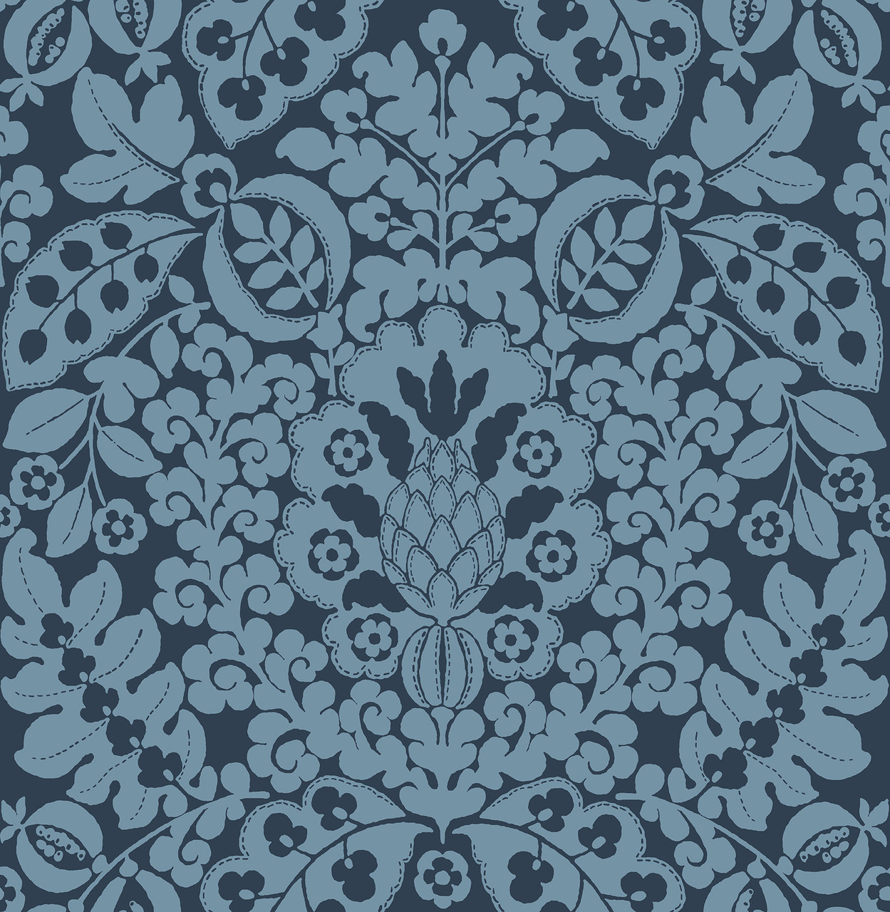 4081-26334 - Marni Navy Fruit Damask Wallpaper. Bring the outdoors in with this elegant botanical print. It features delicate ferns in a soft sage green palette. The design adds a refreshing, organic feel to any room. Printed on high-quality non-woven paper, it is durable and easy to strip. Perfect for a calming bedroom or a farmhouse-style living area. . The width in (in) 20.5 X 33 product length in (ft) covering About 56.4 square feet. Product Match is Straight. Product Repeat is 20.9. Material is Non Woven. Adhesion Type is Unpasted - Washable - Strippable. The Color is Blues