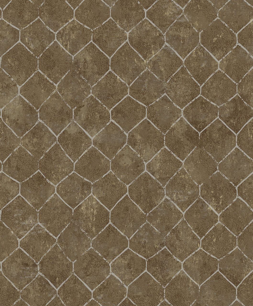 4105-86655 - Rauta Brass Hexagon Tile Wallpaper. Add architectural depth to your walls with this bold geometric design. It features clean lines and a sophisticated navy hue. The raised ink finish provides a subtle tactile texture that catches the light. This wallpaper creates a stunning focal point for offices or modern entryways. It is unpasted and designed for a seamless, professional look.. The width in (in) 21 X 33 product length in (ft) covering About 57.8 square feet. Product Match is Straight. Product Repeat is 25.2. Material is Non Woven. Adhesion Type is Unpasted - Washable - Strippable. The Color is Browns