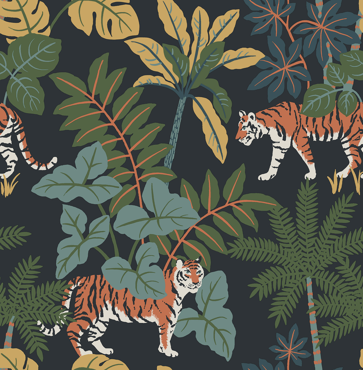 4146-27248 - Caspian Navy Jungle Prowl Wallpaper. Enjoy the luxury of grasscloth without the high maintenance. This faux-woven design mimics the look of natural fibers beautifully. Its soft grey tones provide a neutral, sophisticated backdrop for any decor. Unlike real sisal, this non-woven wallpaper is washable and easy to clean. It is the perfect choice for coastal-inspired or "quiet luxury" interiors.. The width in (in) 20.5 X 33 product length in (ft) covering About 56.4 square feet. Product Match is Straight. Product Repeat is 20.86. Material is Non Woven. Adhesion Type is Unpasted - Washable - Strippable. The Color is Multicolor