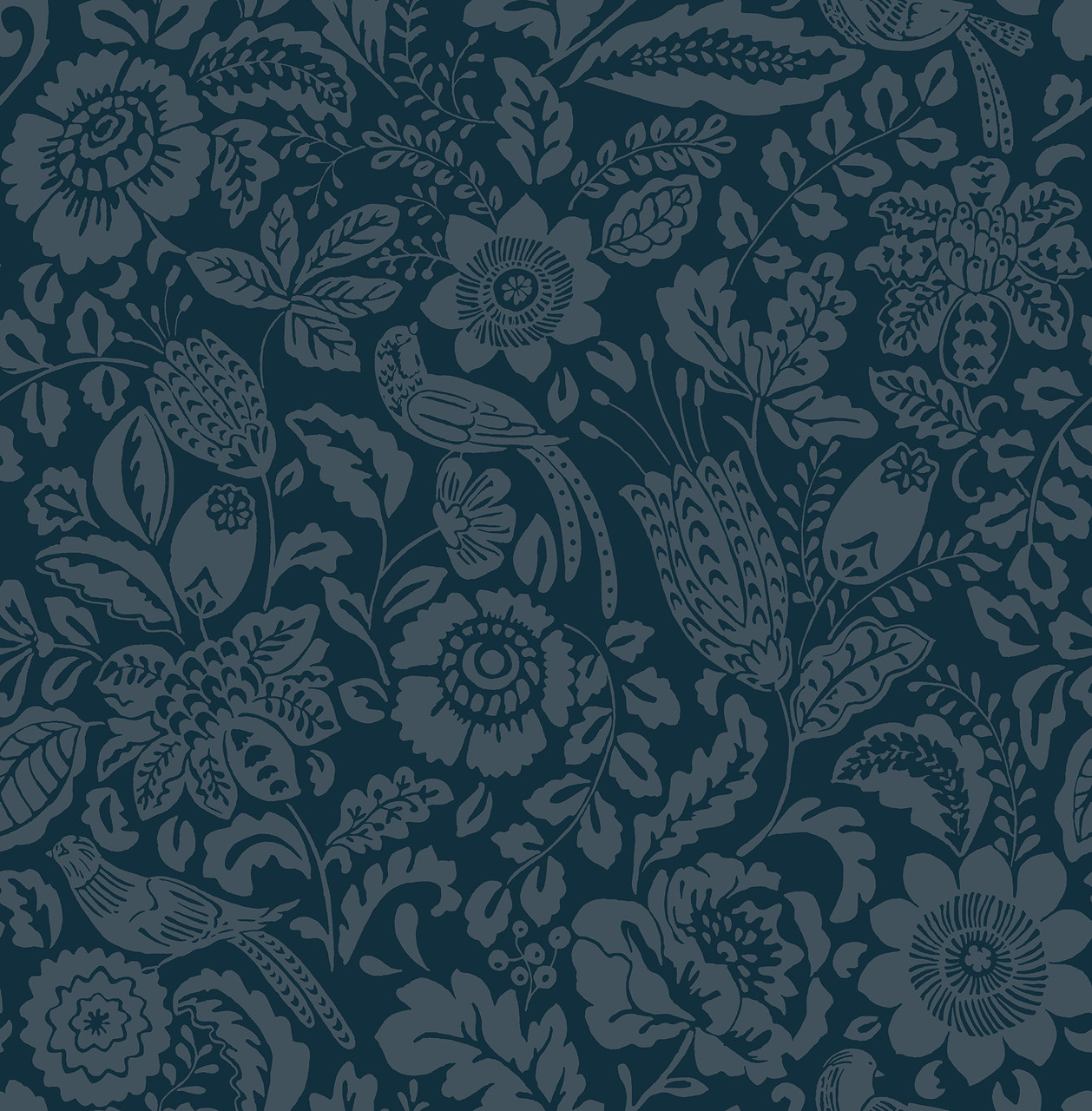 4147-27360 - Marta Navy Floral Trail Wallpaper. Infuse your home with charm and personality. This whimsical topiary print features blooming flowers and small songbirds. The warm apricot background adds a cheerful glow to your space. It balances classic Chinoiserie style with a modern, playful twist. Ideal for a vibrant powder room or a creative dining space.. The width in (in) 20.5 X 33 product length in (ft) covering About 56.4 square feet. Product Match is Straight. Product Repeat is 20.9. Material is Non Woven. Adhesion Type is Unpasted - Washable - Strippable. The Color is Blues