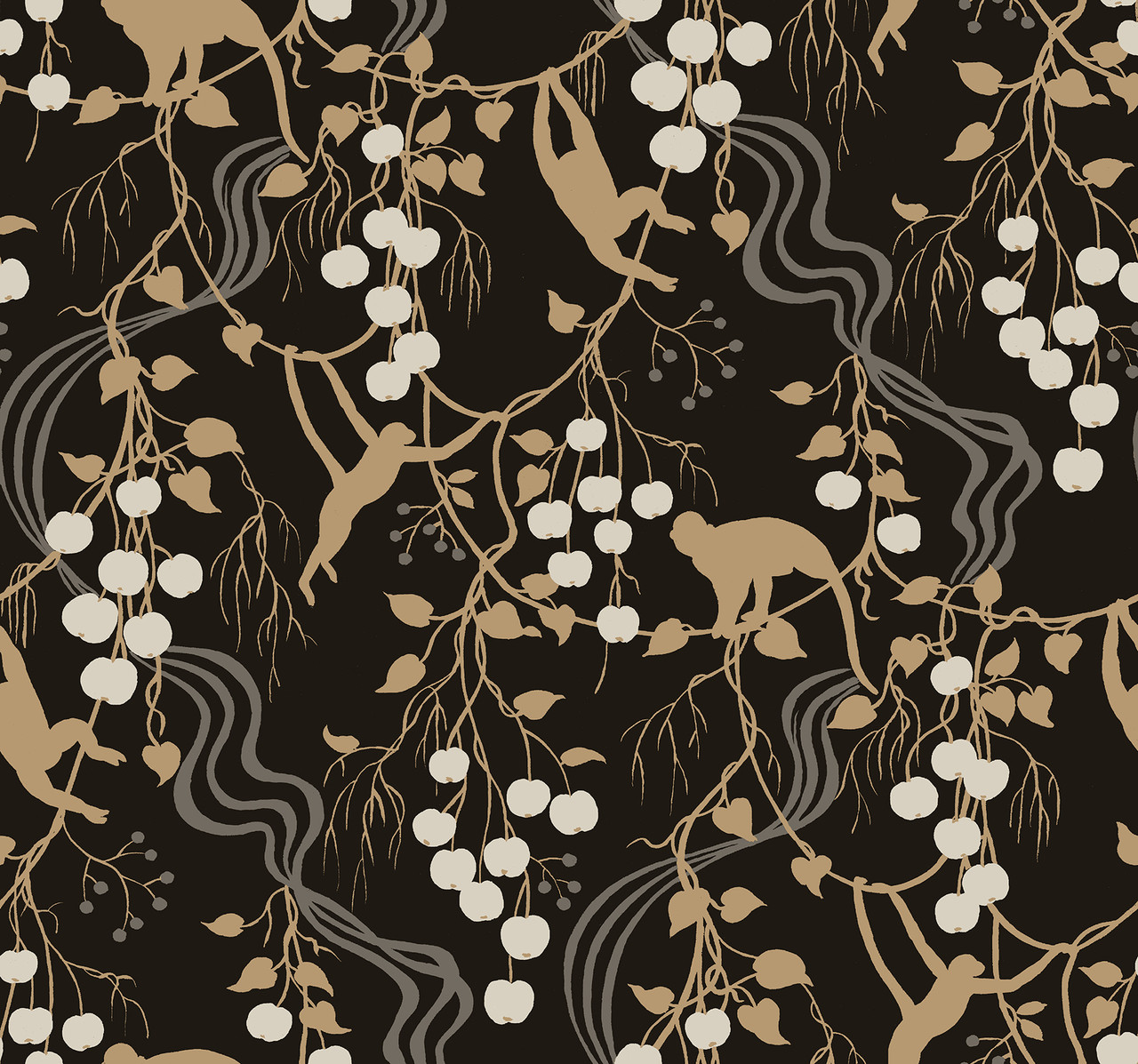 4147-80009 - Linden Black Jungle Canopy Wallpaper. Infuse your home with charm and personality. This whimsical topiary print features blooming flowers and small songbirds. The warm apricot background adds a cheerful glow to your space. It balances classic Chinoiserie style with a modern, playful twist. Ideal for a vibrant powder room or a creative dining space.. The width in (in) 27 X 27 product length in (ft) covering About 60.8 square feet. Product Match is Straight. Product Repeat is 25.25. Material is Non Woven. Adhesion Type is Unpasted - Washable - Strippable. The Color is Blacks