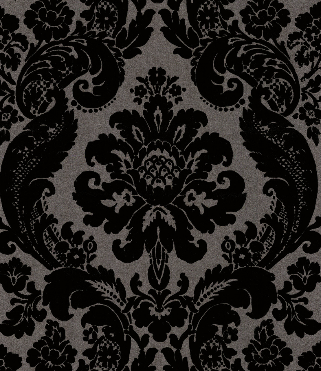 4147-87391 - Shadow Black Flocked Damask Wallpaper. Infuse your home with charm and personality. This whimsical topiary print features blooming flowers and small songbirds. The warm apricot background adds a cheerful glow to your space. It balances classic Chinoiserie style with a modern, playful twist. Ideal for a vibrant powder room or a creative dining space.. The width in (in) 20.5 X 33 product length in (ft) covering About 56.4 square feet. Product Match is Straight. Product Repeat is 21. Material is Non Woven. Adhesion Type is Unpasted - Washable - Strippable. The Color is Blacks