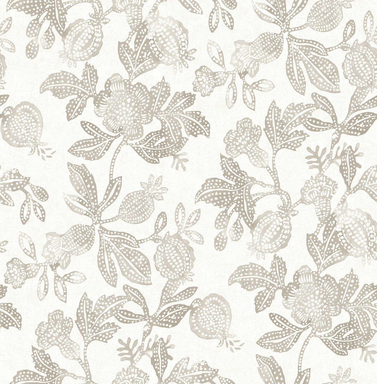 4172-27493 - Beach Rose Neutral Floral Fruits Wallpaper. Infuse your home with charm and personality. This whimsical topiary print features blooming flowers and small songbirds. The warm apricot background adds a cheerful glow to your space. It balances classic Chinoiserie style with a modern, playful twist. Ideal for a vibrant powder room or a creative dining space.. The width in (in) 20.5 X 33 product length in (ft) covering About 56.4 square feet. Product Match is Straight. Product Repeat is 20.9. Material is Non Woven. Adhesion Type is Unpasted - Washable - Strippable. The Color is Greys