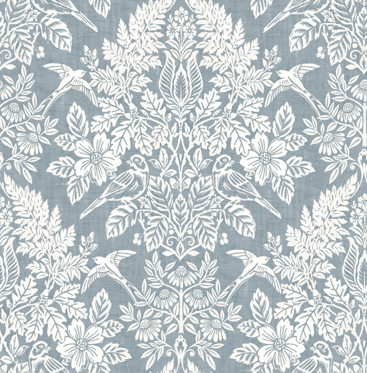 4173-27623 - Finch Light Blue Woodland Damask Wallpaper. Infuse your home with charm and personality. This whimsical topiary print features blooming flowers and small songbirds. The warm apricot background adds a cheerful glow to your space. It balances classic Chinoiserie style with a modern, playful twist. Ideal for a vibrant powder room or a creative dining space.. The width in (in) 20.5 X 33 product length in (ft) covering About 56.4 square feet. Product Match is Straight. Product Repeat is 20.9. Material is Non Woven. Adhesion Type is Unpasted - Washable - Strippable. The Color is Blues