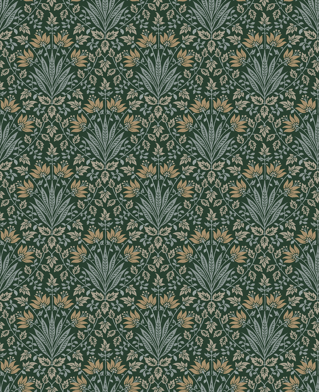 4173-27631 - Woodbury Evergreen Floral Damask Wallpaper. Infuse your home with charm and personality. This whimsical topiary print features blooming flowers and small songbirds. The warm apricot background adds a cheerful glow to your space. It balances classic Chinoiserie style with a modern, playful twist. Ideal for a vibrant powder room or a creative dining space.. The width in (in) 20.5 X 33 product length in (ft) covering About 56.4 square feet. Product Match is Straight. Product Repeat is 8.26. Material is Non Woven. Adhesion Type is Unpasted - Washable - Strippable. The Color is Greens