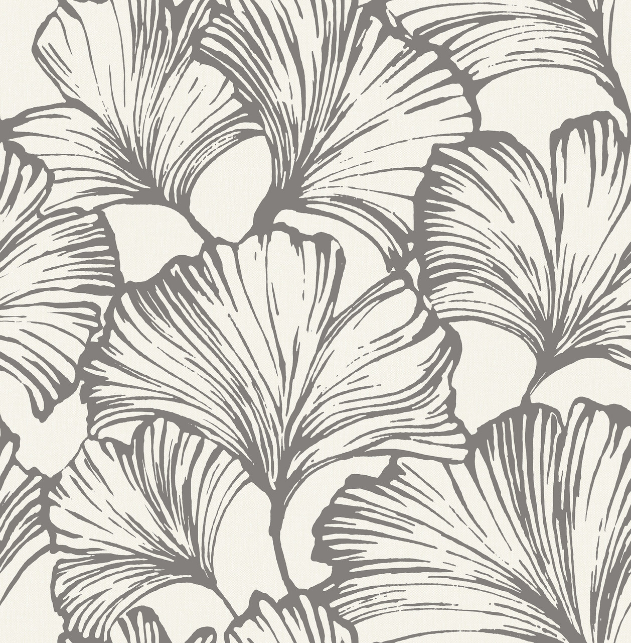 4177-27713 - Kyoto Charcoal Ginkgo Leaf Wallpaper. Infuse your home with charm and personality. This whimsical topiary print features blooming flowers and small songbirds. The warm apricot background adds a cheerful glow to your space. It balances classic Chinoiserie style with a modern, playful twist. Ideal for a vibrant powder room or a creative dining space.. The width in (in) 20.5 X 33 product length in (ft) covering About 56.4 square feet. Product Match is Straight. Product Repeat is 20.9. Material is Non Woven. Adhesion Type is Unpasted - Washable - Strippable. The Color is Greys