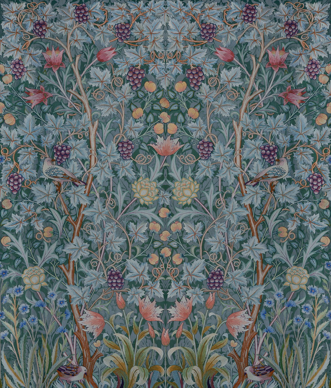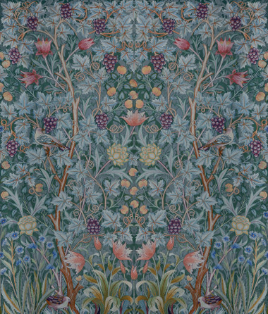 4171-HT84002 - Vine Embroidery Teal Wall Mural. English designer William Morris beautiful work continues to brighten homes across the world. Hidden treasures volume two does amplify and echoes some of Williams work from the past. His contemporary designs are what most designers look for to decorate their projects.. Product Specific: Paste Not Included - Non Woven - Washable - Strippable. It measures 19.3 inches wide by 11.2. feet long covering 6 panels - Measures 9-ft 7.8-in wide by 11-ft 1.9-in tall when assembled. The color is Blues