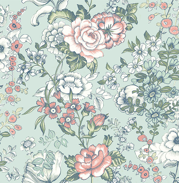 - The Ainsley Aqua Boho Floral 1014-001846 wallpaper from the Kismet collection features a delightful pattern of delicate flowers, leaves and stems set against a pastel background. This attractive floral wallpaper is available in different colorways, and this version has blue and pink tones. The pattern is drop match with a pattern repeat length of 21 inches.
