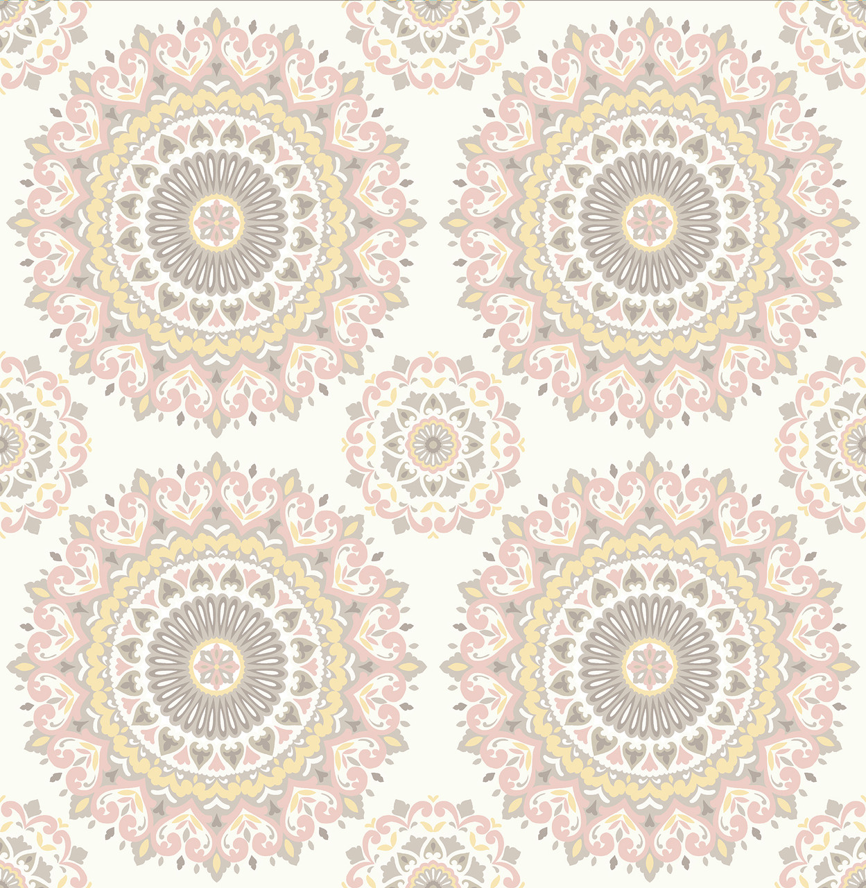 - Kitchen & Bath Essentials 2766-001805 - Priya Medallion Wallpaper Blush. An exciting assortment of shapes and patterns come together to bring life to your indoor surroundings. Blush details blended with bright colors swirl across the mandala print found in the Priya Medallion Wallpaper. Different kinds of designs layer each other in circular wheels mimicking beautiful medallions, spinning fantasy into your home. The Kitchen & Bath Essentials collection allows everyone to reimagine how their kitchens and bathrooms should look like. Change the notion of kitchens and bathrooms having basic tiles around their walls and showcase beautiful imagery through this collection's innovative arts designed specifically to enhance kitchens and bathrooms.