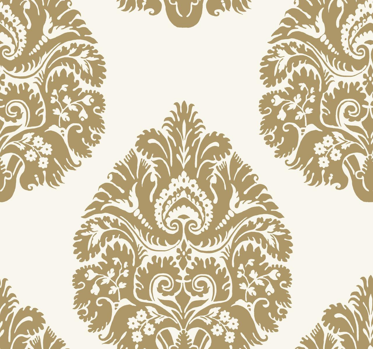 KT2141 - Teardrop Damask Wallpaper. Ronald Redding 24 karat is a fine quality luxurious sophisticated wallpaper that is design to achieve modern traditionalism to it best.. Packaged and sold as a double roll. Product dimension is 27 in x 27 ft = 60.75 sq ft. Product dimension in metric is 68.58 cm x 8.22 m = 5.63 sq m. Key Features: Unpasted - Washable - Strippable. Pattern repeat is 25.25 in. Pattern match is Straight. Substrate is Wallpaper. Theme is Damask. The color is Gold
