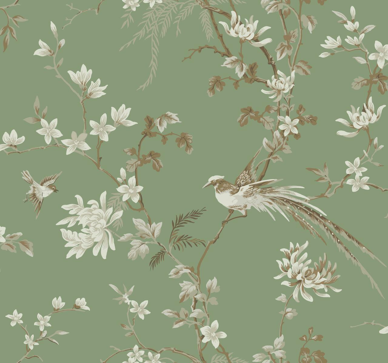 KT2175 - Bird And Blossom Chinoserie Wallpaper. Ronald Redding 24 karat is a fine quality luxurious sophisticated wallpaper that is design to achieve modern traditionalism to it best.. Packaged and sold as a double roll. Product dimension is 27 in x 27 ft = 60.75 sq ft. Product dimension in metric is 68.58 cm x 8.22 m = 5.63 sq m. Key Features: Unpasted - Washable - Strippable. Pattern repeat is 25.25 in. Pattern match is Drop. Substrate is Wallpaper. Theme is Botanical. The color is Green