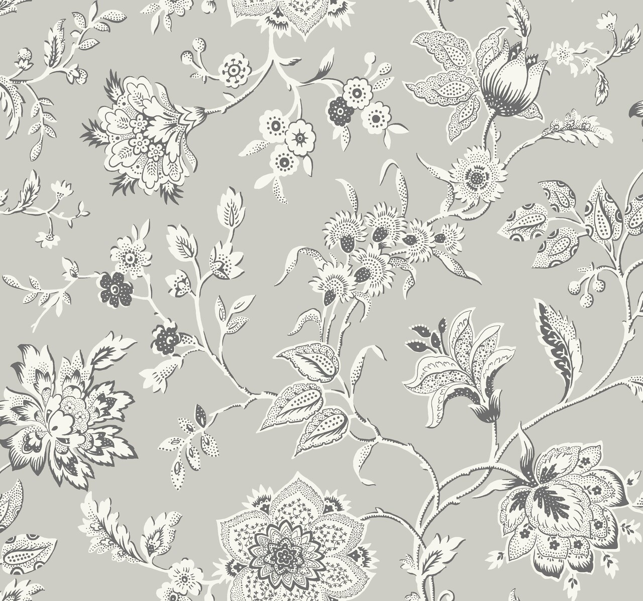 RT7823 - Grey Sutton Wallpaper. York quintessential design for timeless romance is a wallpaper design that is celebrated as world toiles. This toile resource library measures approximately 27 wide by 27 feet long. covering About 60.8 square feet. Product Specifications: Unpasted - Washable - Strippable. Material is Non Woven. The repeat is 25.25. The Match is Drop. The color is Grey