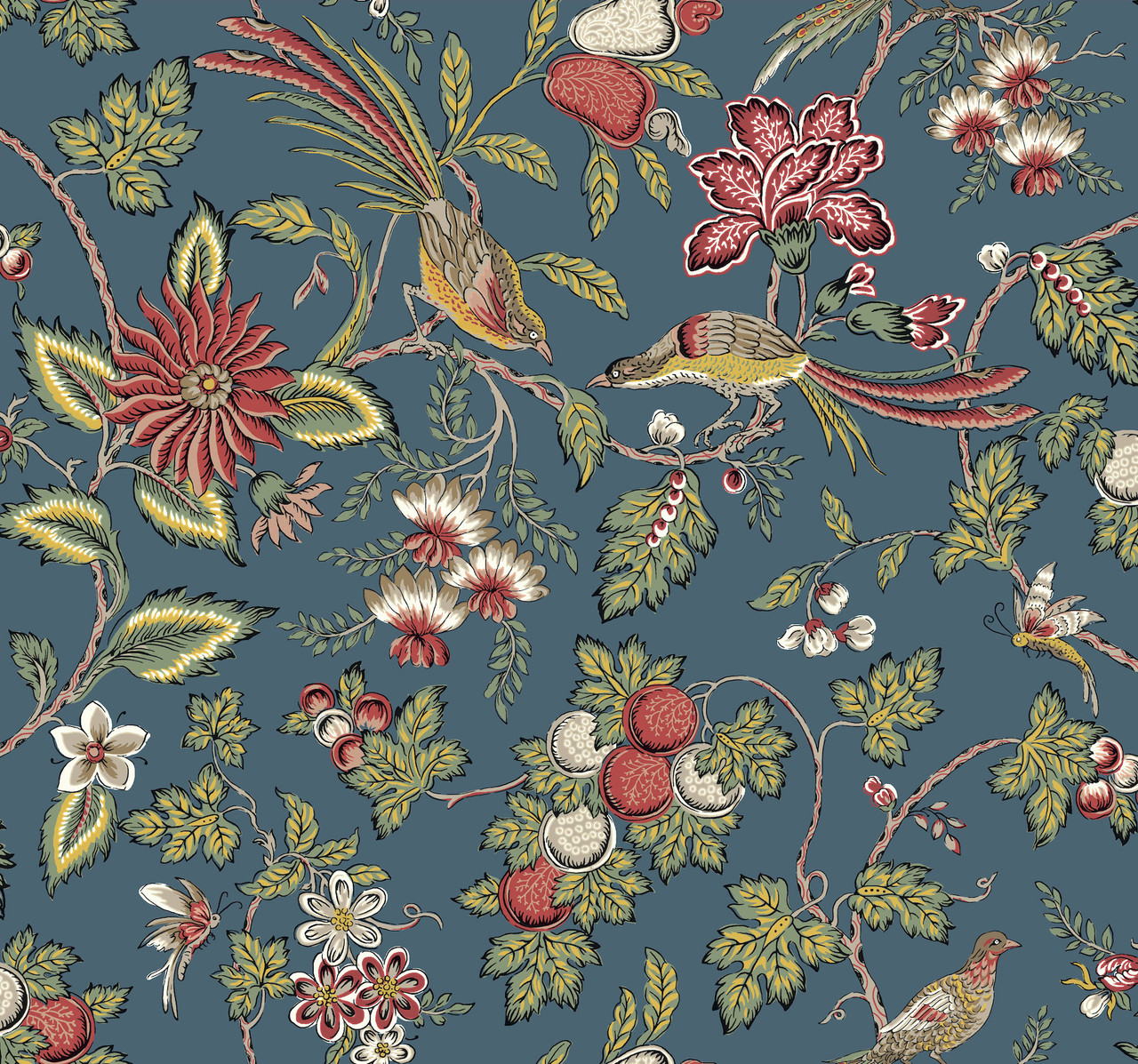 VP1311 - Parterre Indigo Jacobean Wallpaper. Vintage botanical prints inspired by artisanal block printing celebrate the beauty of nature and gardens. This Parterre Indigo Jacobean Wallpaper measures approximately 27 inches wide by 27 feet long, measuring. About 60.8 square feet . Product Specific: Unpasted - Non Woven - Washable - Strippable. Product Repeat 25.3. Product Match Drop. The color is Indigo