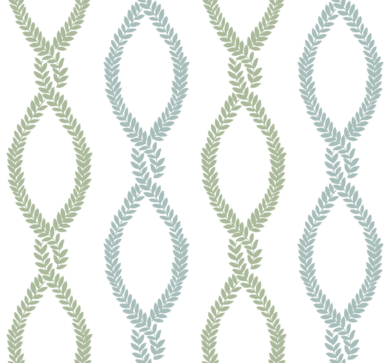VP1321 - Laureate Light Green Vine Trellis Wallpaper. Vintage botanical prints inspired by artisanal block printing celebrate the beauty of nature and gardens. This Laureate Light Green Vine Trellis Wallpaper measures approximately 27 inches wide by 27 feet long, measuring. About 60.8 square feet . Product Specific: Unpasted - Non Woven - Washable - Strippable. Product Repeat 25.3. Product Match Straight. The color is Blue & Green