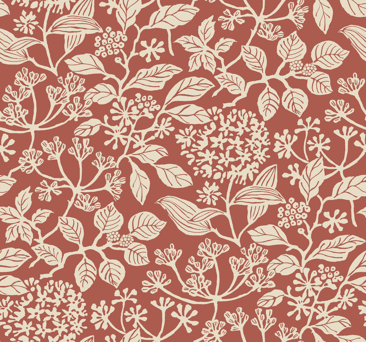 VP1342 - Rowen Ruby Botanical Wallpaper. Vintage botanical prints inspired by artisanal block printing celebrate the beauty of nature and gardens. This Rowen Ruby Botanical Wallpaper measures approximately 27 inches wide by 27 feet long, measuring. About 60.8 square feet . Product Specific: Unpasted - Non Woven - Washable - Strippable. Product Repeat 25.3. Product Match Straight. The color is Ginger