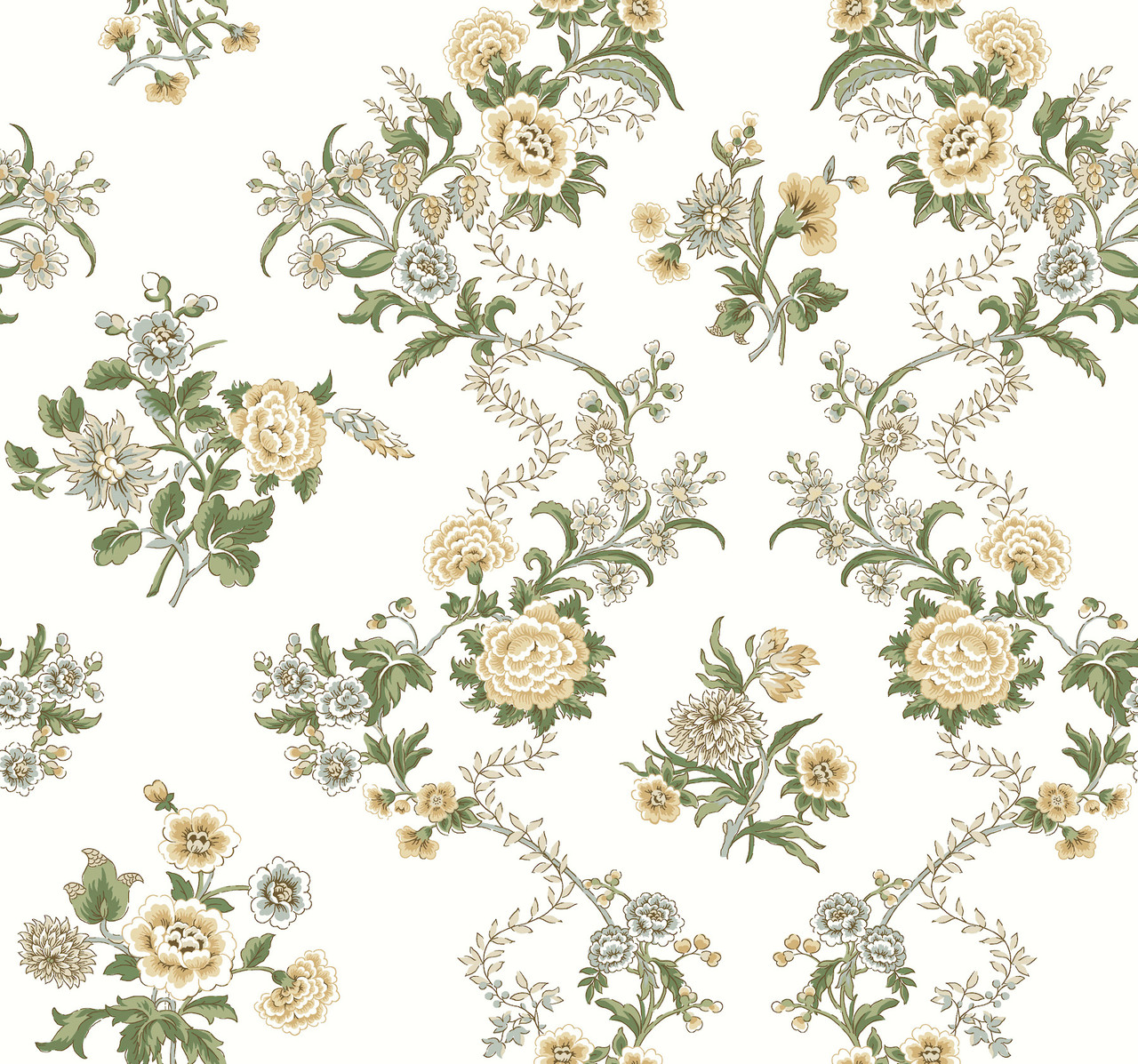 VP1421 - Genevieve Butter Floral Trail Wallpaper. Vintage botanical prints inspired by artisanal block printing celebrate the beauty of nature and gardens. This Genevieve Butter Floral Trail Wallpaper measures approximately 27 inches wide by 27 feet long, measuring. About 60.8 square feet . Product Specific: Unpasted - Non Woven - Washable - Strippable. Product Repeat 25.3. Product Match Straight. The color is Butter & Green