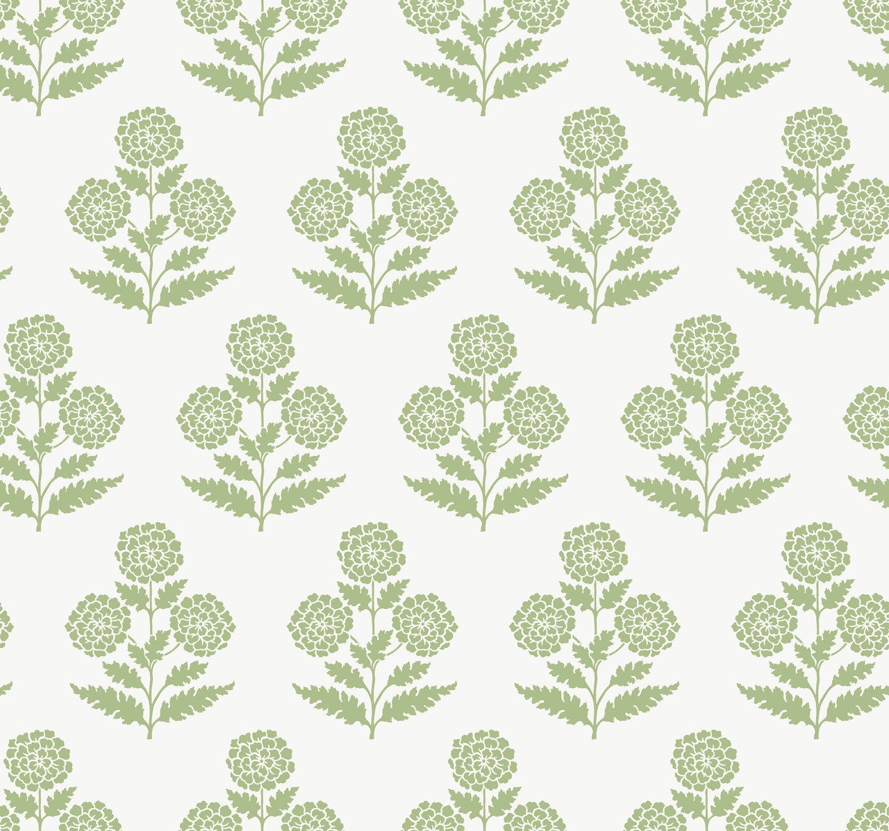 VP1436 - Souci Green Marigolds Wallpaper. Vintage botanical prints inspired by artisanal block printing celebrate the beauty of nature and gardens. This Souci Green Marigolds Wallpaper measures approximately 27 inches wide by 27 feet long, measuring. About 60.8 square feet . Product Specific: Unpasted - Non Woven - Washable - Strippable. Product Repeat 25.3. Product Match Straight. The color is Green
